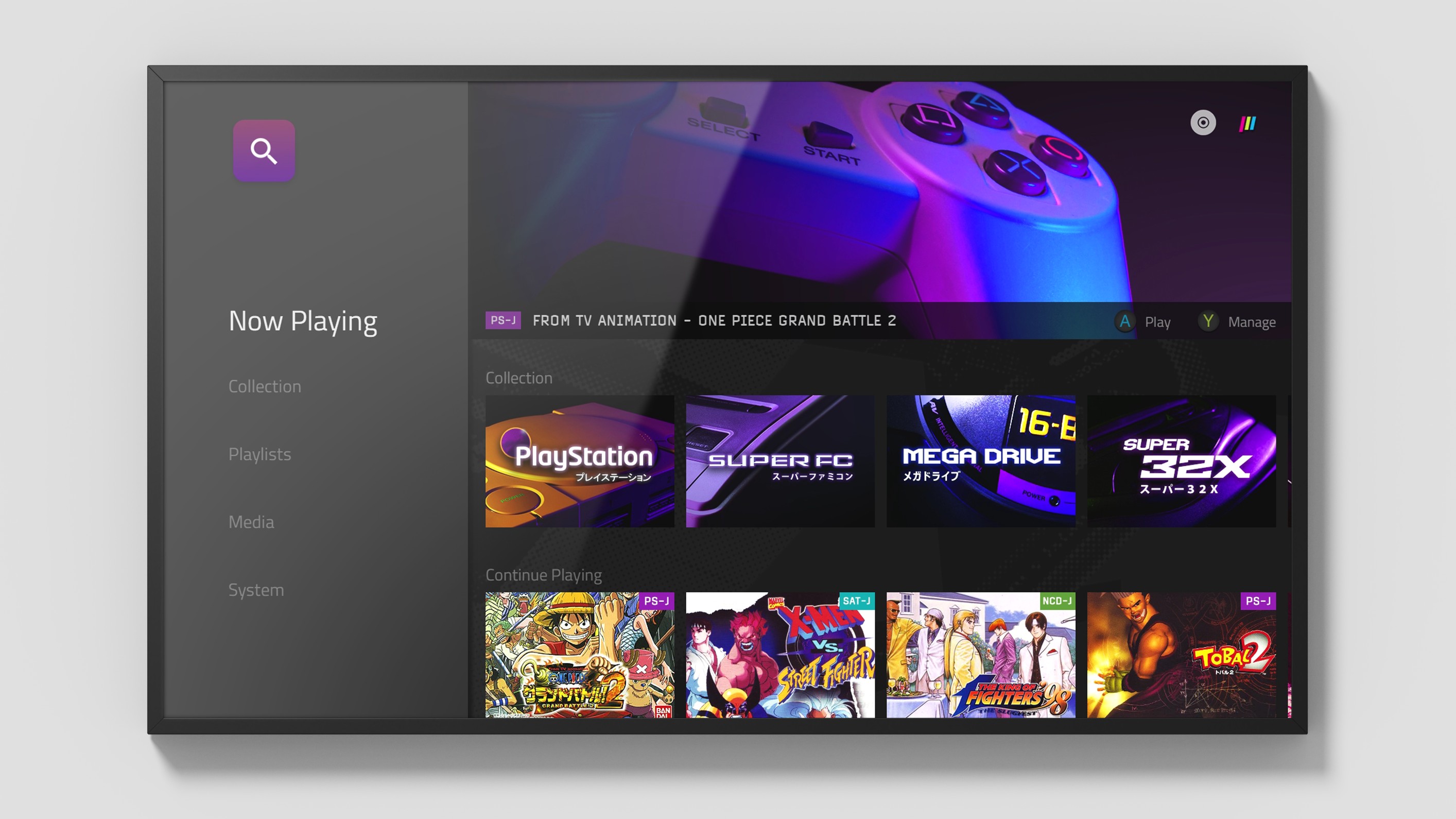 Una delle comodità di Polymega è il suo sistema operativo, che può leggere e tradurre in “immagini” (file digitali) il contenuto delle cartucce e dei CD originali, in modo da potervi poi accedere senza doverli inserire di nuovo. Il database che si viene a creare è elegante e include descrizioni e immagini per ogni gioco e per un certo periodo Playmaji ha anche detto che avrebbe aperto un negozio digitale accessibile da Polymega, per acquistare e scaricare giochi (di catalogo o realizzati ex novo), ma non è mai successo.