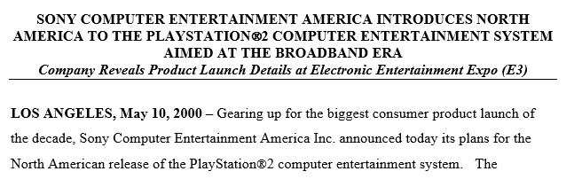 La vita pubblica di PlayStation 2 (nei primi documenti viene anche scritto senza lo spazio a dividere nome e numero) cominciò il 2 marzo 1999, con il comunicato che dichiarava completati “i lavori di ricerca e sviluppo per dare vita al successore di PlayStation”3. Il tono era solenne e c'era quasi la sensazione di trovarsi di fronte all’annuncio del prossimo allargamento di una qualche famiglia reale della vecchia Europa. I tempi furono calcolati quasi alla perfezione: la macchina della comunicazione venne avviata, come detto, il 2 marzo 1999 e quella prima fase sarebbe durata quasi un anno: PlayStation 2 salì sugli scaffali dei negozi giapponesi il 4 marzo 2000 (tra ottobre e novembre nel Nord America e in Europa). Ci volle molto meno prima che il monolite nero, come venne fin da subito chiamato dalla stampa specializzata e dal pubblico più attento, si vedesse catalogato come qualcosa di più che una semplice console da gioco.