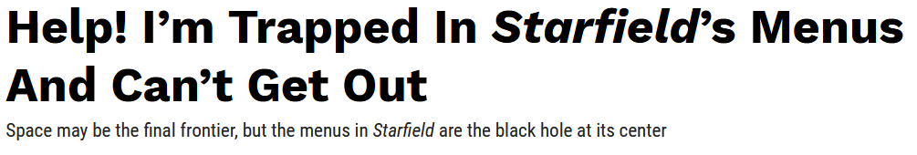 Questo è un articolo di Kotaku che parla di Starfield (Bethesda per Xbox e PC). Nelle prime giornate di disponibilità di Starfield, si è parlato molto dei suoi menu e delle schermate di caricamento, questo titolo mi sembra che riassuma in maniera molto divertente la situazione. Vorrei però chiarire che ho giocato pochissimo a Starfield e che, per quanto mi riguarda, il gioco potrebbe anche avere la migliore interfaccia utente mai progettata prima.