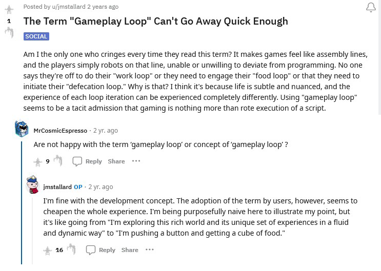 Chi apre la discussione si lamenta dell’utilizzo dell’espressione “gameplay loop” nel gergo di tutti i giorni degli appassionati di videogiochi. “Sono l’unico a cui vengono i brividi ogni volta che lo legge?” si chiede in apertura jmstallard. Alla domanda “il problema è nel termine ‘gameplay loop’ o nel suo concetto?”, l’autore riprende la parole e la sua replica è molto interessante, a mio modo di vedere. In sostanza dice che l’utilizzo di quella formula negli ambienti dello sviluppo dei giochi non lo infastidisce, “ma il fatto che i giocatori abbiano iniziato a usarla, mi pare che svilisca l’intera esperienza. Il mio è un atteggiamento esageratamente naif, lo so e lo sto facendo apposta, ma è come se invece di dire ‘sto esplorando in maniera dinamica un mondo pieno di cose da fare e di esperienze che mi aspettano’, ci si limitasse a pensare: ‘sto premendo un pulsante per ottenere un’unità di cibo’.”