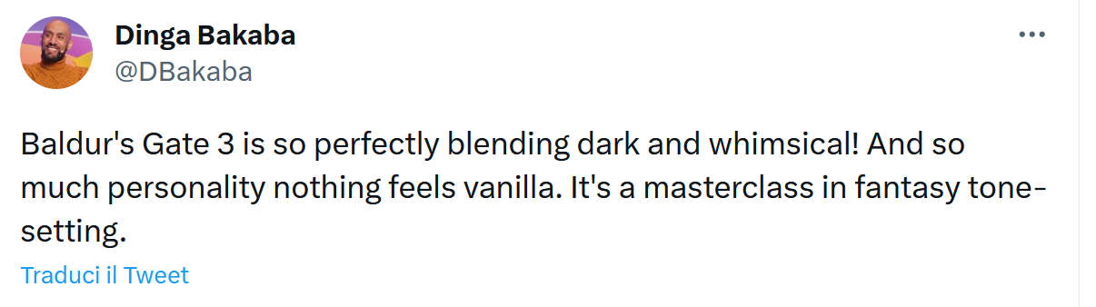 Mi sono imbattuto di nuovo in “vanilla” in questi giorni, complice la popolarità di Baldur’s Gate III (Larian Studios per PC Windows, di prossima uscita anche per MacOS, PlayStation 5 e Xbox Series X|S). Si tratta del nuovo episodio di una serie creata da Bioware (Mass Effect) alla fine degli anni Novanta e che attende un seguito addirittura dal 2000. Ding Bakaba di Arkane Lyon (Deathloop, 2021) ha commentato il gioco con un tweet3 interessante.