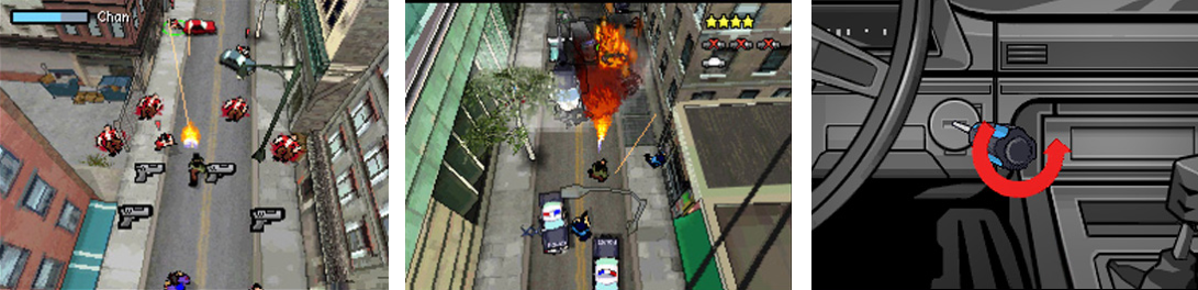 Per l’occasione, Liberty City sarà completamente esplorabile fin dalle primissime fasi di gioco, il che potrà naturalmente avvenire anche e soprattutto a bordo di uno dei tanti veicoli da rubare semplicemente premendo “Y” vicino a una portiera: se la vettura è parcheggiata, oltretutto, va messa in moto, il che avviene dopo aver risolto un minigioco. Minigioco che non si ripete sempre identico a se stesso, ma cambia a seconda della tipologia di auto e può passare dal chiedere di giocherellare con il blocchetto d’accensione aiutati da un cacciavite o, per fare solo un altro esempio piuttosto classico, al dover ricollegare due fili. Tutta l’esperienza di Chinatown Wars promette, comunque, una marea di “minigiochi”, il che non dovrebbe essere motivo di lamentela proprio per nessuno. Apriamo una parentesi a riguardo, che ci serve: la definizione di “minigioco” come utilizzata in questi anni, è fuorviante. Dici “minigioco” e subito si pensa a una qualche idea stupida e banale per allungare la brodaglia. No, non funziona così: in altri titoli, ma soprattutto in GTA Chinatown Wars, esistono fasi di gioco in cui l’interazione (permessa dal touch screen) raggiunge nuovi livelli, il sistema di controllo muta momentaneamente e la ricetta di gioco viene arricchita da nuovi, momentanei, elementi.