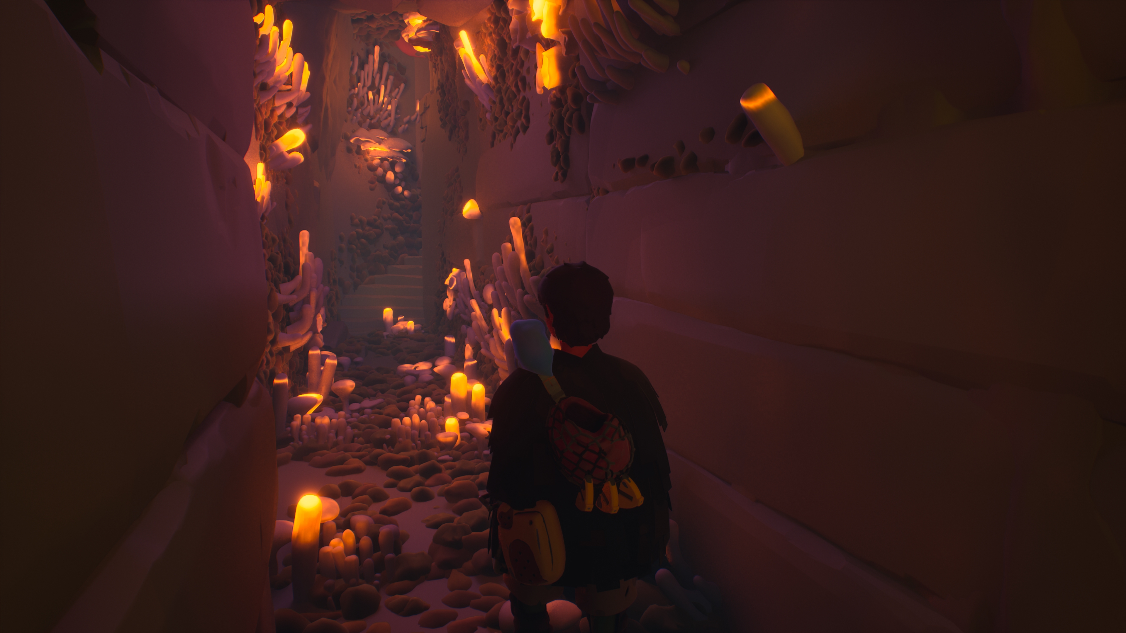 L’illuminazione. Le pareti bruciate da un sole estivo accecante lasciano velocemente il palco ai passaggi bui e freschi all’interno della montagna. La contrapposizione accompagna lo stile di gioco, che passa dall’essere pericoloso e urgente (durante la scalata) a meditativo e rilassato (riavvolta la corda). Quando poi si raggiungono le enormi cavità della pancia della montagna, si stendono delle nottate rese indimenticabili dalla bioluminscenza di funghi e altre creature.