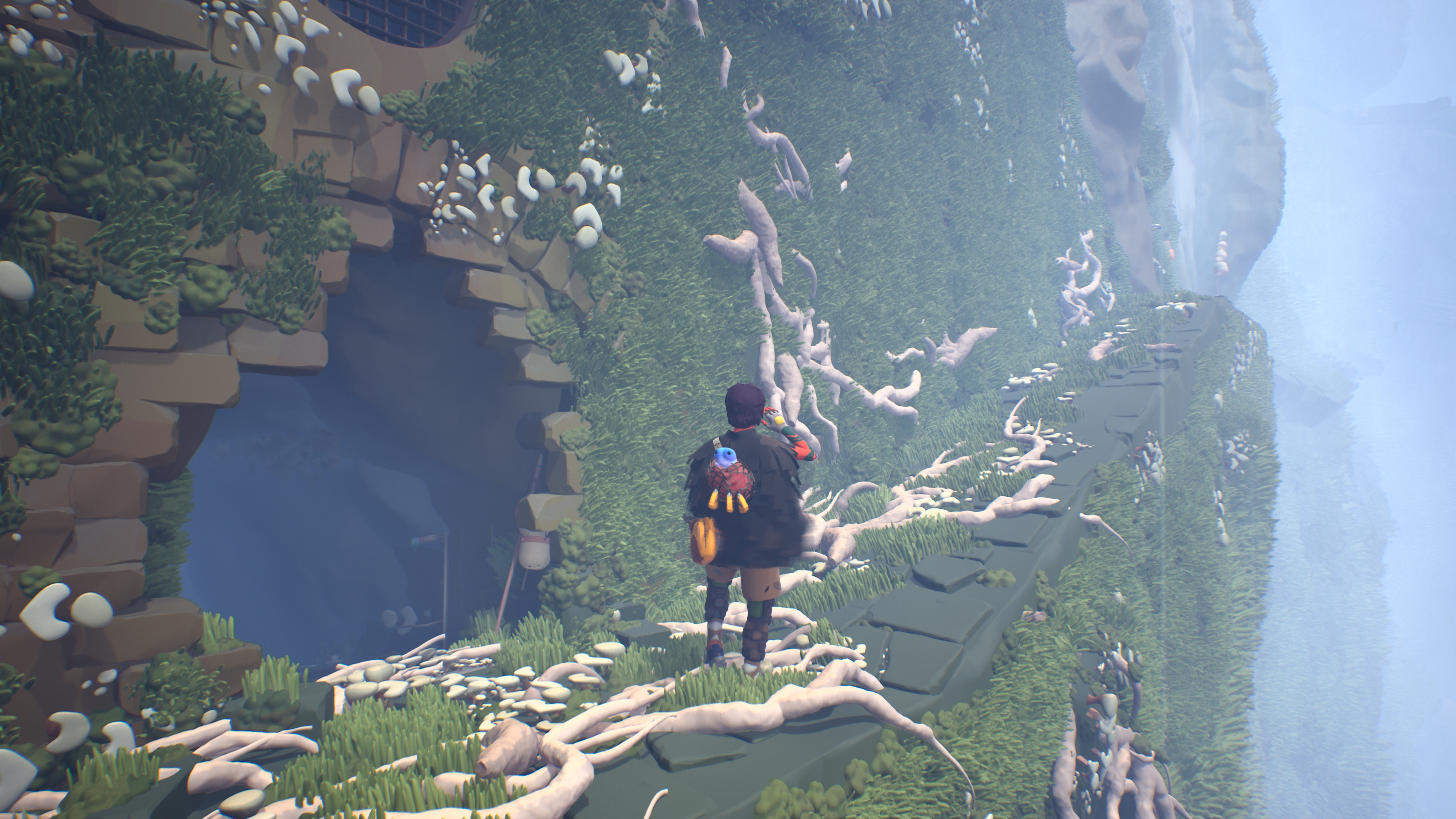Invece no, Jusant è soddisfacente quanto basta per non sembrare stupido e pretestuoso e non lo è a tal punto da allungare i tempi e allontanare eccessivamente i cambi di ritmo delle fasi in cui la scalata finisce e si contempla il mondo o si legge della sua storia. Tutte e tre sono arterie che portano sangue all’organismo di gioco: scalare, guardare, leggere. Tutte funzionano in maniera impeccabile.