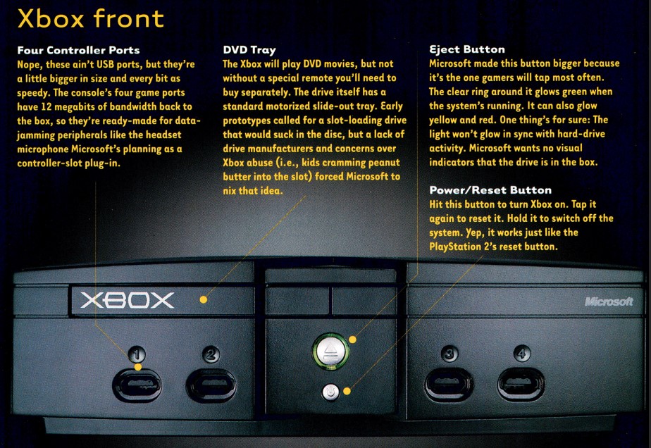 Fino a PlayStation 2, le console avevano avuto un tasto dedicato all’accensione e uno al riavvio. Sony aveva accorpato le due funzioni in un unico tasto, dal funzionamento inizialmente percepito come complesso o, perlomeno, meritevole di approfondimenti4. Microsoft qui ci teneva a far sapere che era d’accordo con la nuova filosofia di Sony e che chi era già abituato a PlayStation 2, si sarebbe ritrovato a casa.