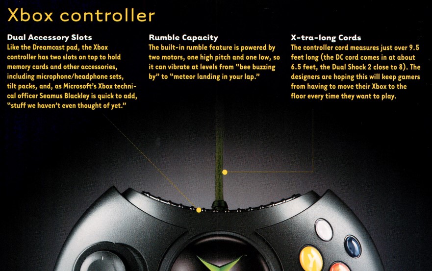 In quel numero, quindi, ci sono quelle pagine che vogliono spingere Xbox. Non sono le uniche e non mancano le pubblicità più tradizionali, fatte di proclami arroganti e di promesse assolute. In quell’inserto c’è un paginone centrale che ritrae la console e il controller, con una serie di testi che seguono altrettante frecce e che vogliono spiegare il perché e il percome di Xbox e del suo controller. Ne riporto alcuni.