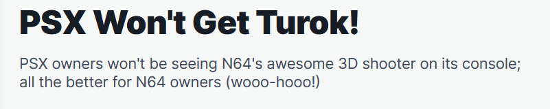 Intanto le riviste online, anche quando non hanno alcuna licenza ufficiale da lucidare, ci tengono a mettersi in scia. La redazione dedicata a Nintendo 64 di IGN (maggiori dettagli più sotto) presenta così la notizia che Turok: the Dinosaur Hunter (Acclaim, 1996) sarebbe rimasta un’esclusiva per la console di Nintendo: