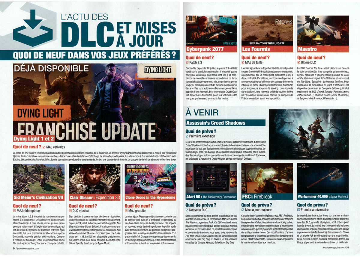 Con la promessa di presentare “qualcosa di nuovo per i vostri videogiochi preferiti”, la sezione “DLC et mises a jour” (DLC e aggiornamenti) scorre velocemente i nuovi contenuti a disposizione di videogiochi già disponibili, da Dying Light a Clair Obscur: Expedition 33. Di ciascuno viene detto brevemente in cosa consiste quello che viene proposto dai rispettivi editori. Nella stessa sezione c’è spazio per uno sguardo fulmineo ai DLC e aggiornamenti in arrivo (e ormai arrivati naturalmente), come l’espansione Gli artigli di Awaji per Assassin’s Creed Shadows o il sostanzioso aggiornamento di FBC: Firebreak.