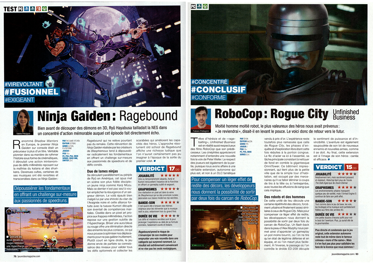 Le anteprime della rivista non sorprendono e vengono riassunte in uno schema che assegna tante più stelline quanto più il gioco appare promettente. Anche l’impostazione delle recensione è quella che ci si può aspettare da una rivista con venticinque anni nelle memory card. L’inusuale è che la lunghezza non supera mai la singola pagina. L’usuale è la pagella con una scala numerica che va da 1 a 20, come da tradizione del sistema scolastico francese. Ninja Gaiden: Ragebound si prende la valutazione più alta (17/20) e viene sviscerato con qualche riga di commento assegnata alla giocabilità, alla grafica, al sonoro e alla durata. Cucchiaio di legno encrittato a Destiny 2: I confini del destino, un nuovo contenuto per lo sparatutto di Bungie che non va oltre 13 punti. Lo stesso trattamento è stato riservato a Killing Floor 3. In questo numero la redazione ha quindi ridotto la scala dai 20 ai 5 punti (la valutazione più frequente è di 16/20, con cui sono stati promossi ben nove giochi). Da rivedere la pratica di aggiungere in grafica tre hashtag per ogni gioco, spiazzante come un saluto nazista di Musk.